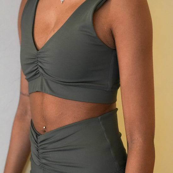 Designed to flatter and support in all the right places, this sports bra features a sleek V-neckline with delicate ruching that enhances your natural shape. An elastic underbust band provides added support and a secure feel, keeping you comfortable through every movement. Made from a luxuriously soft four-way stretch fabric, it delivers breathable comfort and flexibility with a smooth, second-skin fit. Perfect for low to medium-impact workouts or effortless everyday wear, this bra blends elevated style with reliable performance.